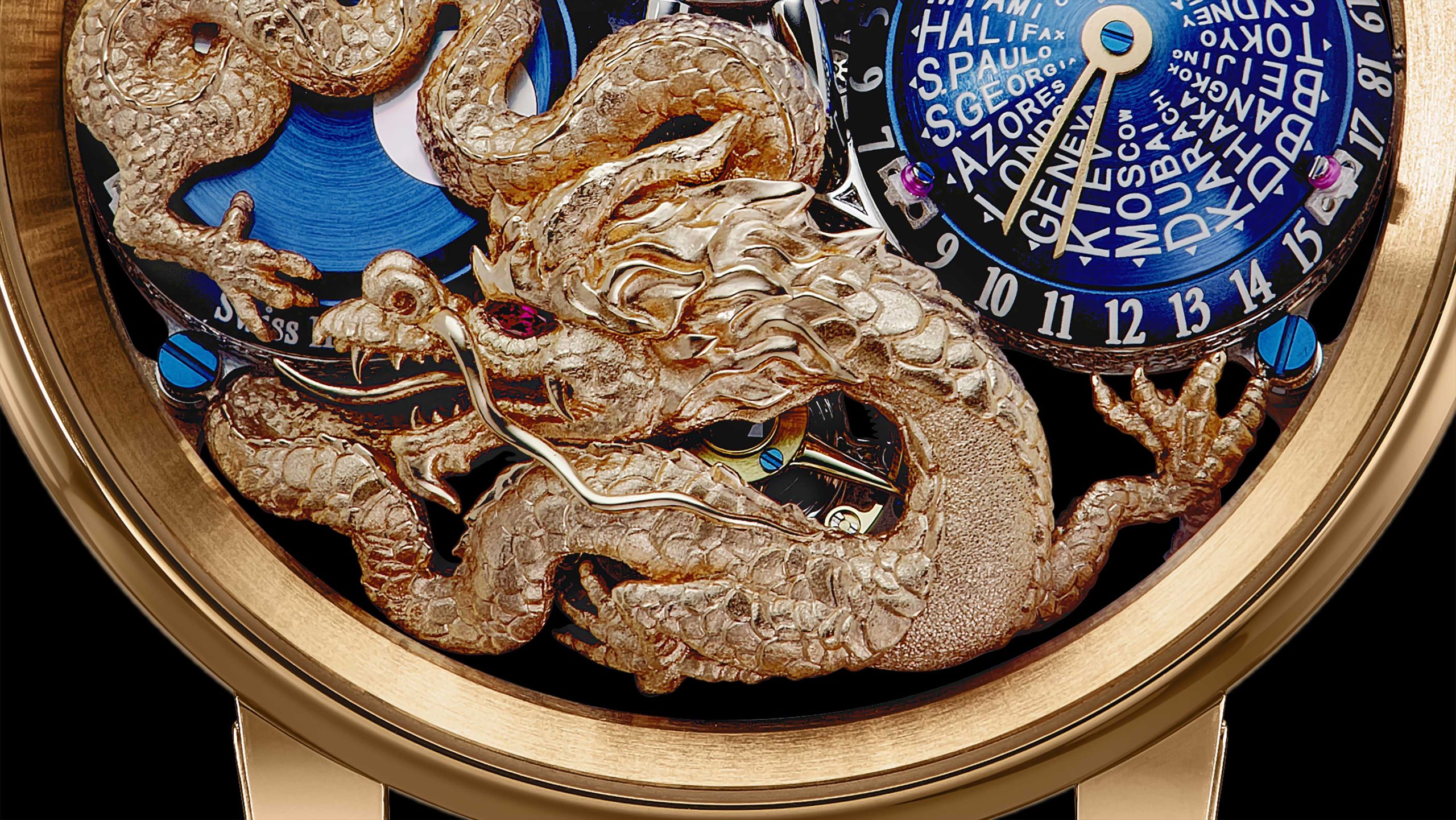 In perfect symmetry, the Mother-of-Pearl moon phase is positioned at 9 o’clock, revealed through the Dragon’s coiled lower body, while the Dragon’s head and upper body rest on the flying tourbillon itself.
