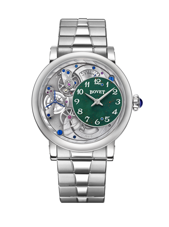 On the dial side showcasing the natural gemstone, the manufacture movement has been inverted and opened up to expose BOVET’s in-house balance wheel and regulating organ, as well as a portion of the gear train. On top of the seconds wheel is a running seconds indicator with three fire-blued hands.