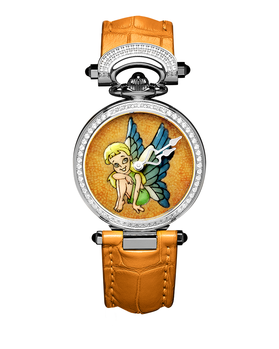 The process of producing this dial is extraordinarily complex. First, in the center of the dial is a hand-painted fairy, filled with Super-LumiNova. After the miniature-painting process, the dial is covered with a protective lacquer, securing the art for eternity.